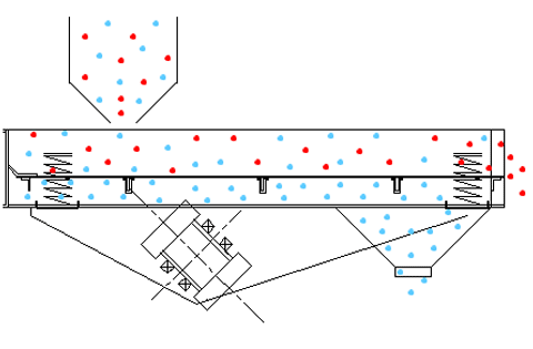 直線篩使用振動電機作為振動源,采用雙振動電機驅(qū)動,當(dāng)兩臺振動電機做同步、反缶旋轉(zhuǎn)時,振動電機偏心塊所產(chǎn)生的激振力在平行于振動電機軸線的方向相互抵消,在垂直于振動電機軸線的方向重疊為一合力,因此振動篩機的運行軌跡為一直線。兩電機軸相對篩面有一傾角,在激振力和物料自重力的合力下,物料在篩面上被拋起跳躍式向前做直線運動,通過各不同層次篩網(wǎng)篩分多種規(guī)格的篩上物、篩下物,又從不同的出料口排出,流入料倉或盛料筒,從而達到對物料進行篩分的目的。